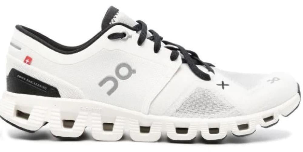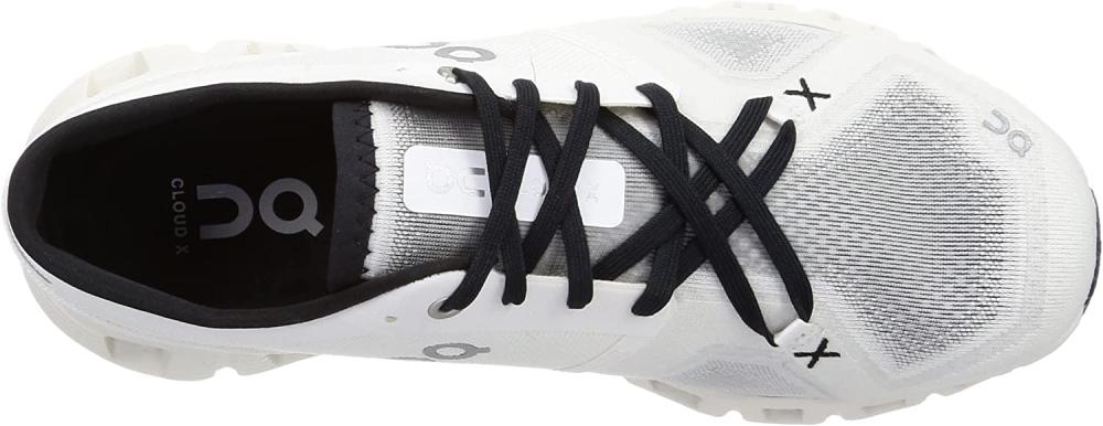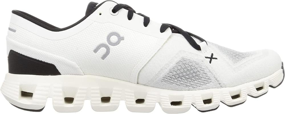 أبيض، أسود، جزء علوي منسوج، طبعة شعار جانبية، غلق برباط أمامي، مقدمة بيضاوية، نعل مطاطي سميك.