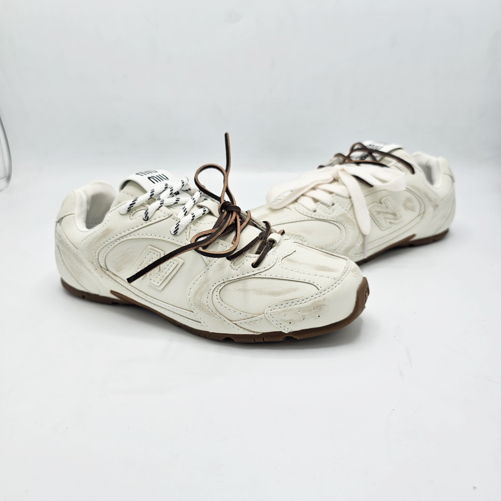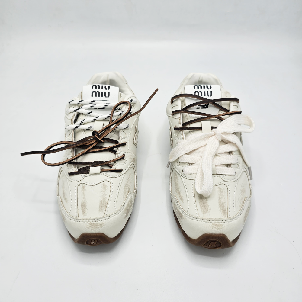 تصميم حصري من الجلد بتأثير فينتج، وهو ثمرة تعاون Miu Miu وNew Balance. تعيد ميو ميو تقديم التصميم بالكامل، ما يجعله خفيفاً للغاية، وتتلاعب بأربطة منقوشة ذات ألوان وأنسجة متباينة. يكتمل جمال التصميم بلوغو يضفي لمسة أيقونية.